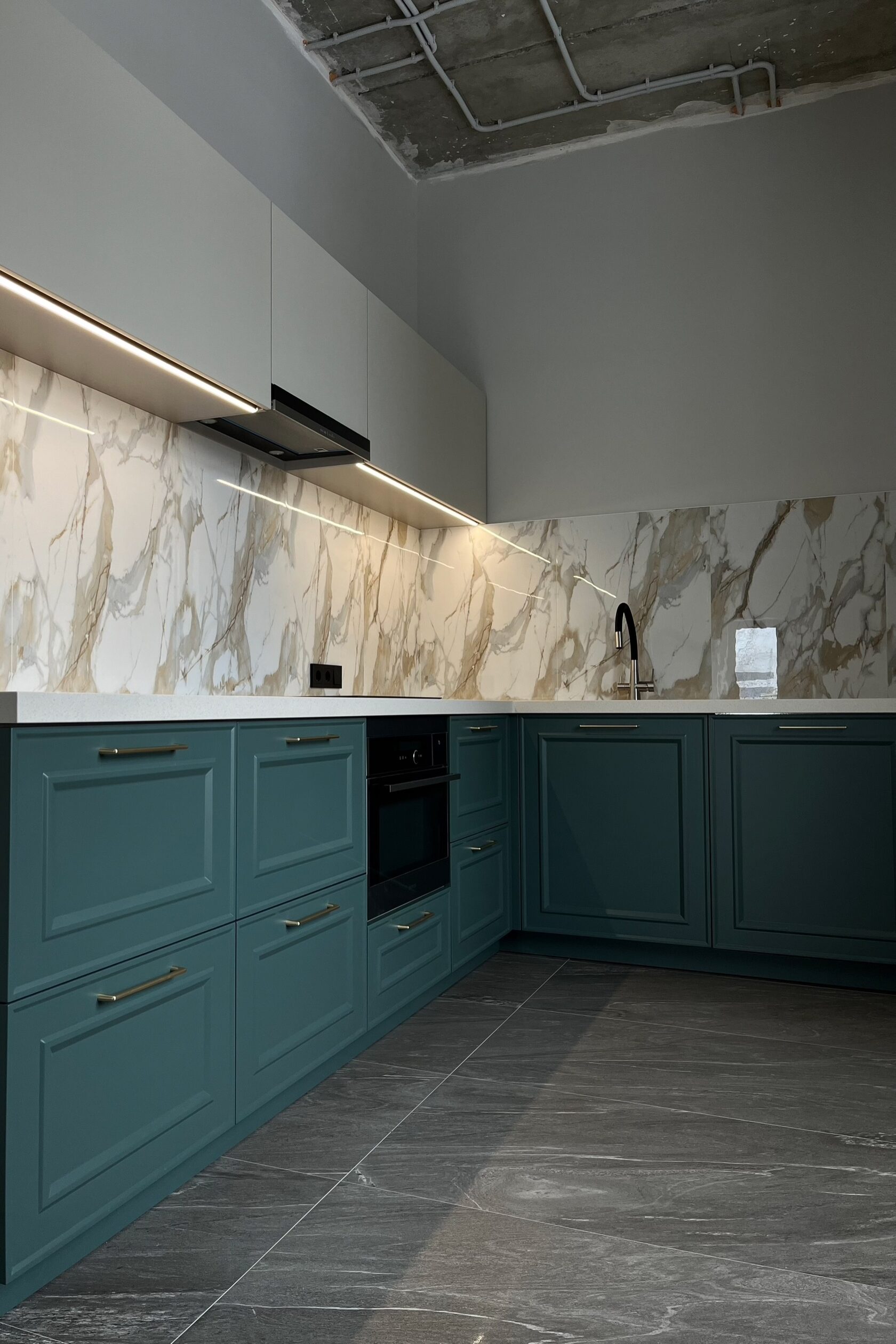 Каркас ЛДСП Нордеко, фасады МДФ М-Line, ручки накладные, верхние push-to-open», столешница камень, фурнитура Hettich.